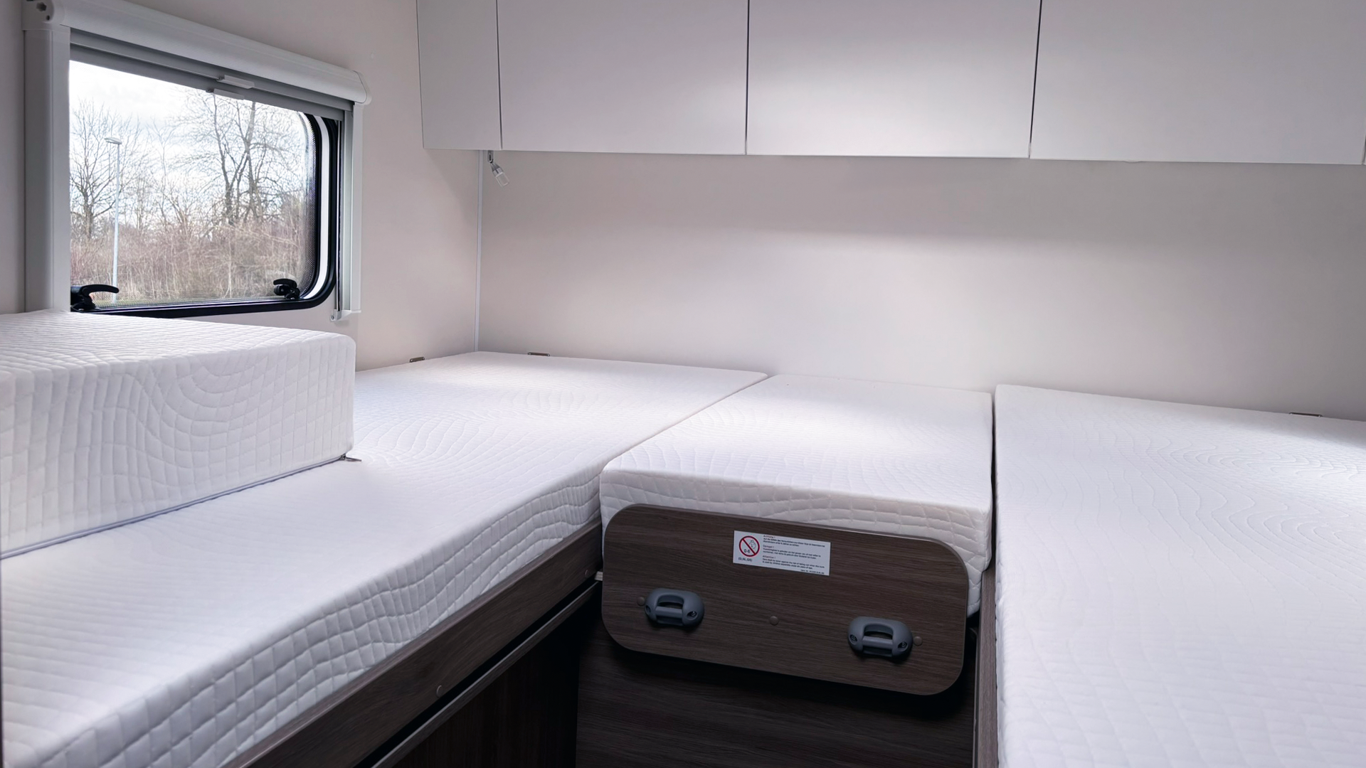 • 2 Einzelbetten à 80cm x 200cm im Heck, die zu einer großen Liegefläche verbunden werden können